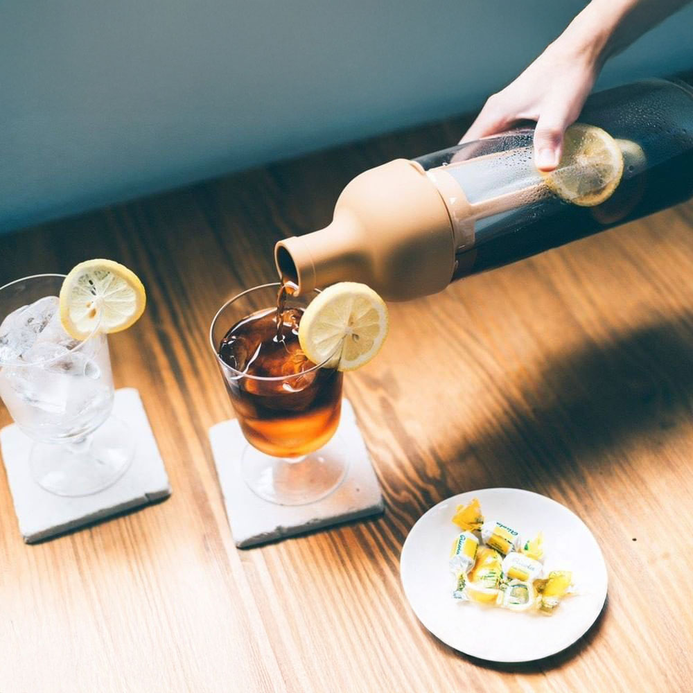 Brews iced coffee with only ground coffee and water. Put ground coffee in the strainer, set it on the spout and slowly pour in water to brew. Leave in your refrigerator for about eight hours to brew.