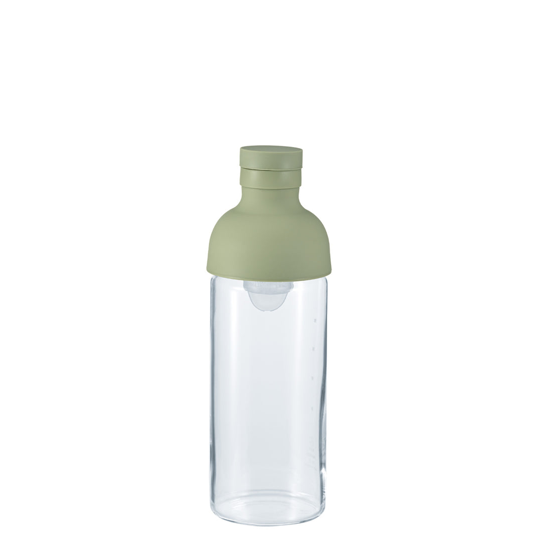 Wine bottle shaped cold brew tea bottle. Created from the idea to enjoy cold brew tea like wine during meals, we designed the wine bottle shaped filter-in bottle. The filter is fixed onto the spout, so you can pour directly.