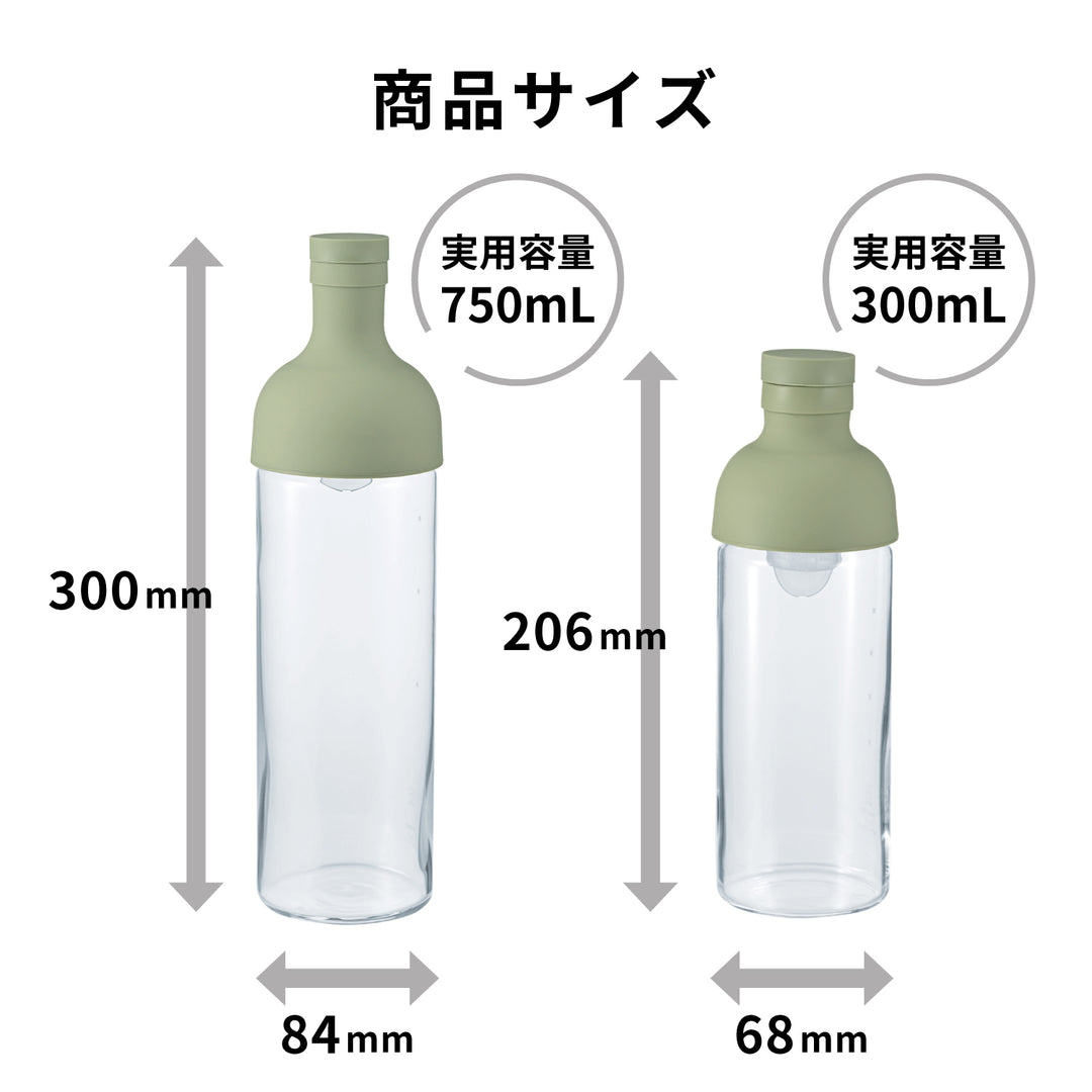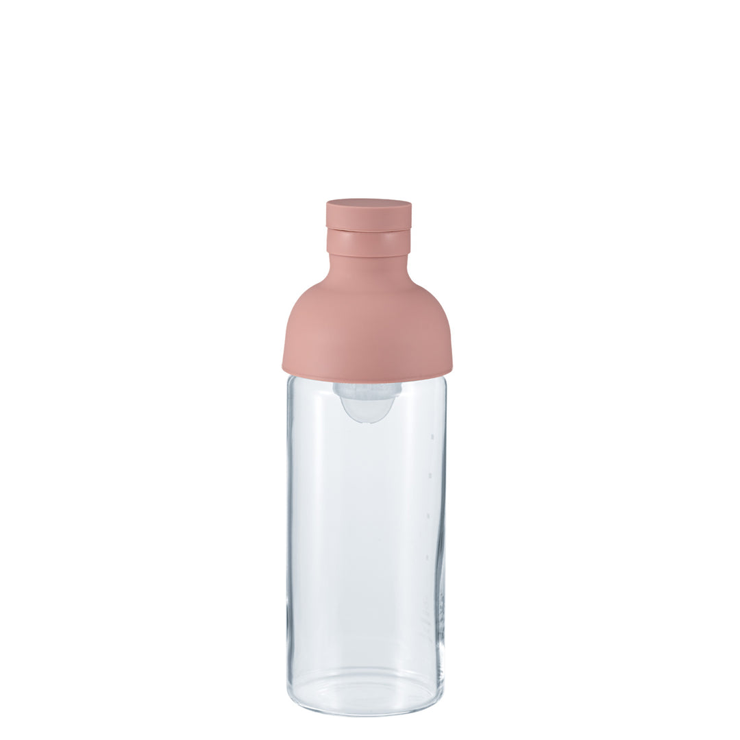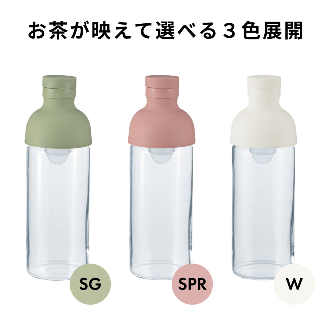 Wine bottle shaped cold brew tea bottle. Created from the idea to enjoy cold brew tea like wine during meals, we designed the wine bottle shaped filter-in bottle. The filter is fixed onto the spout, so you can pour directly.