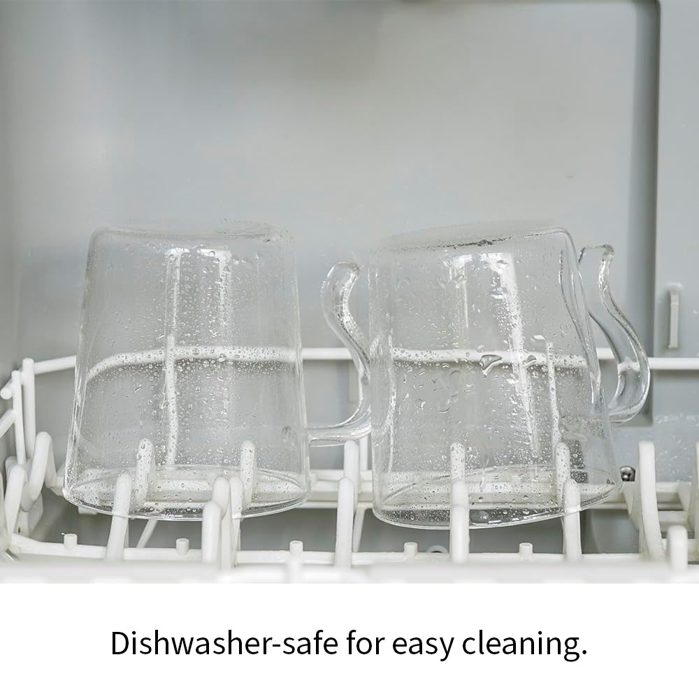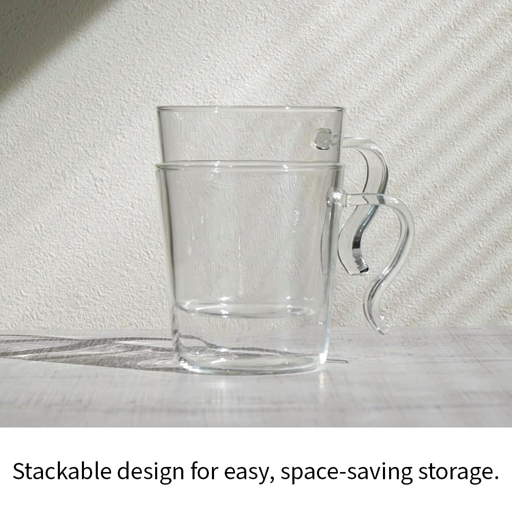 Durable heat-resistant glass mugs that stack neatly for compact storage.