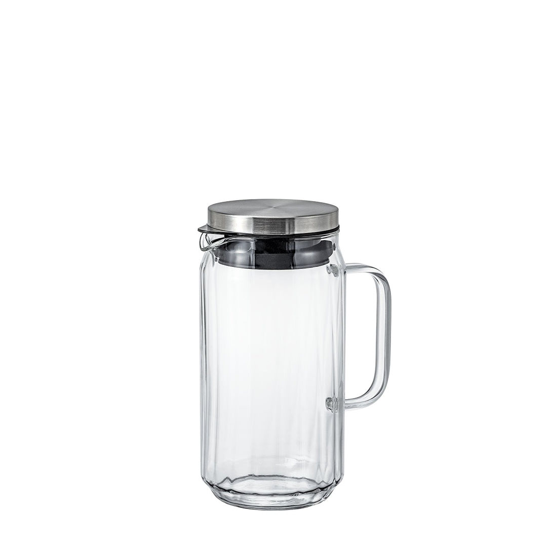 A stylish heatproof glass water jug with elegant vertical lines.